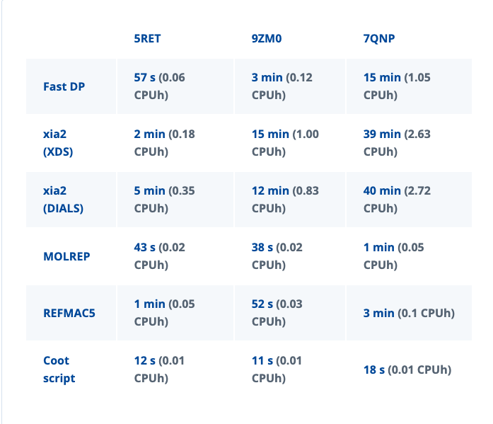 With the standard 20 CPUh included per month in a free license, it is possible to explore these workflows in several iterations. As an example, the xia2 (XDS) job took 2 min and 41 s to run for the 5RET dataset on a 4 CPU node. This is converted to CPUh via the calculation: