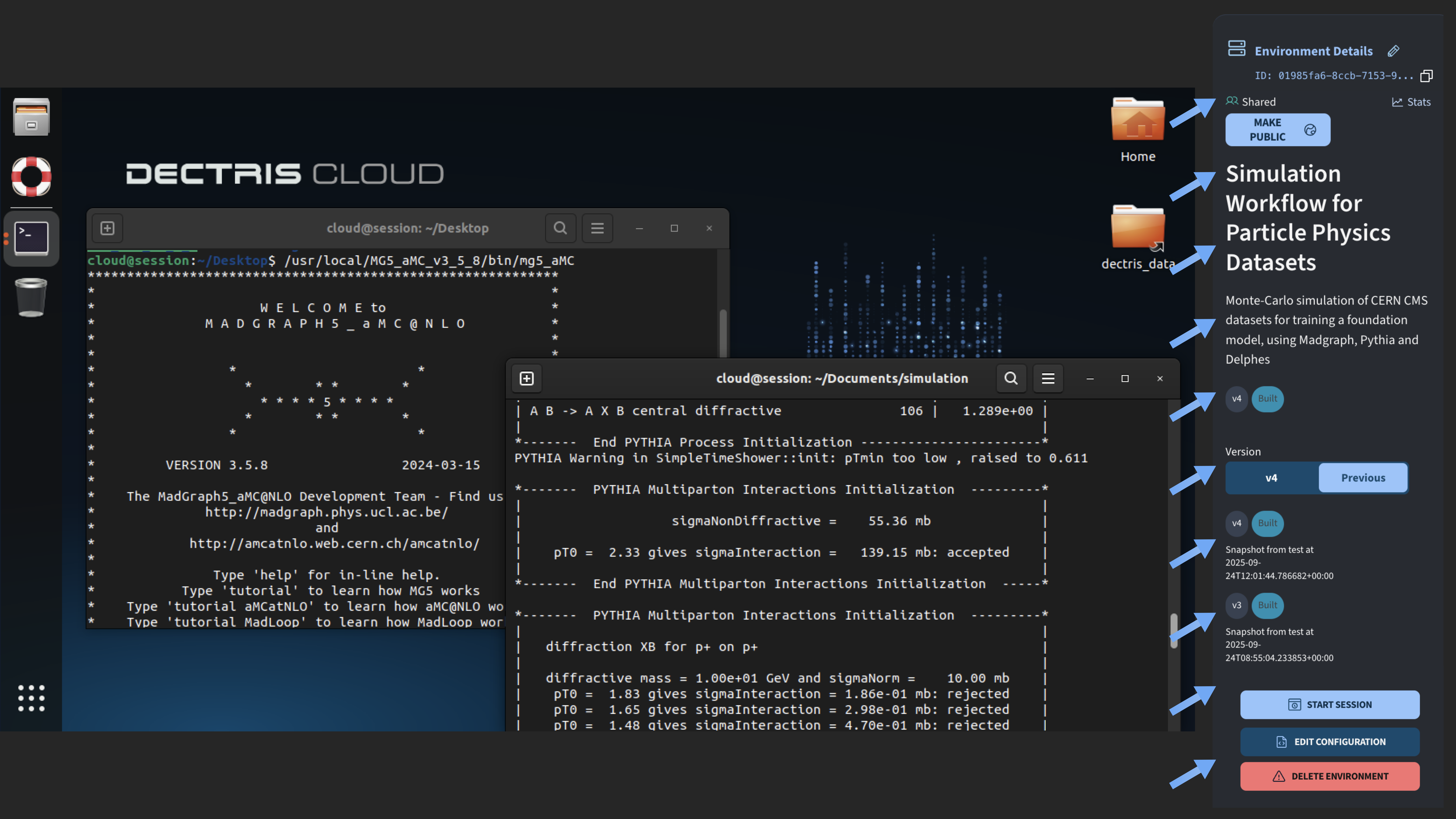 With the environment in place, Philip created a job template to make the simulation workflow easy to run and reuse. Job templates expose key parameters, such as the number of simulated events, the physics process, and random seed, directly in the DECTRIS CLOUD interface.