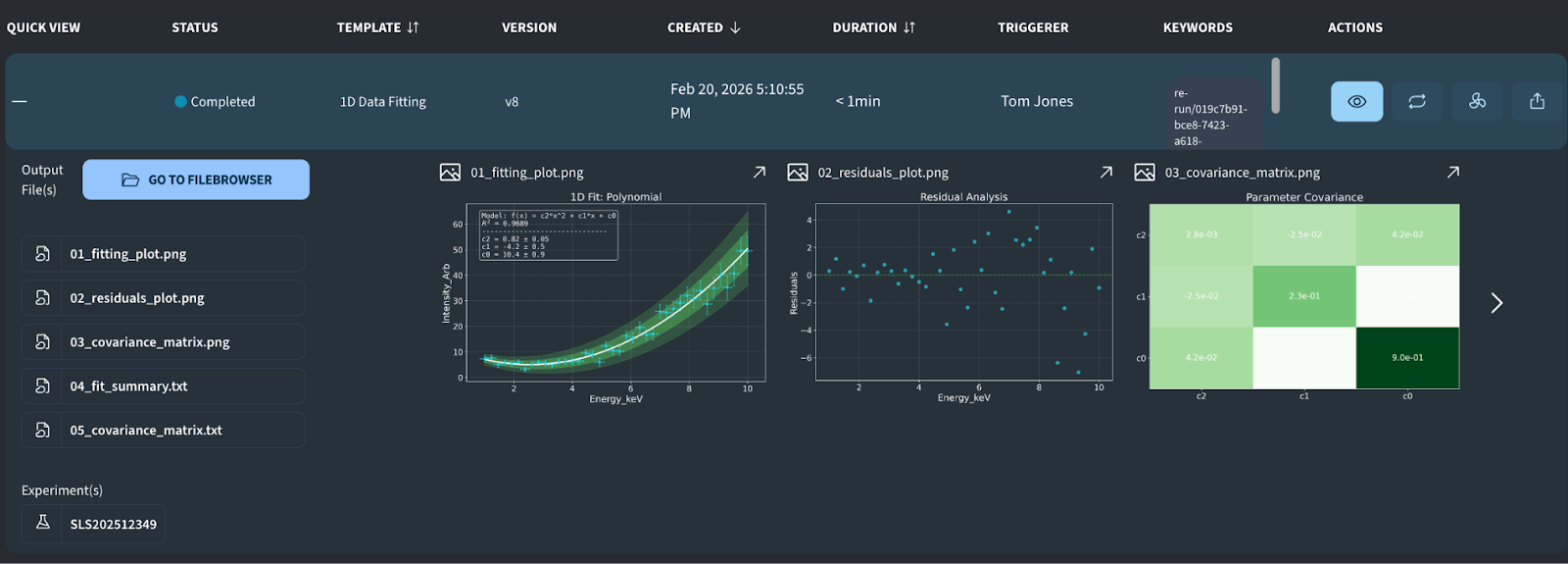 Image: Example output from the “1D Data Fitting” job, featuring a scatter plot with the fitted line, a residuals analysis, and a covariance matrix heatmap.